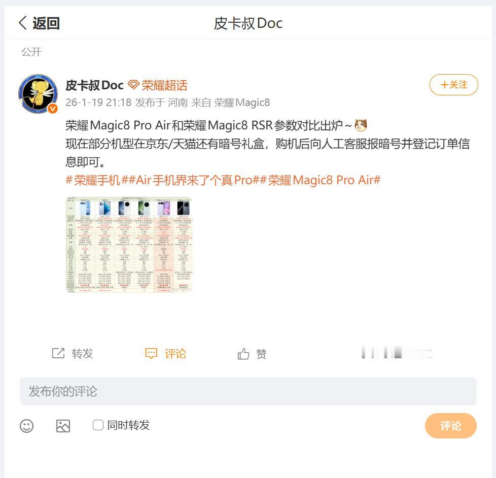 荣耀刚刚发布了,荣耀Magic8 Pro Air、以及荣耀Magic8 RSR保时捷设计,那么好多小伙伴就会问了,在现阶段众多荣耀4000档位以上的机型中,如何选择和定位这两款产品呢?@皮卡叔Doc老师专门制作了这张表格,各项参数都蛮细致的,对于我来说RSR更适合自己一些,搭配增距镜潜望长焦更优秀啦 畅聊数码新品 数码资讯