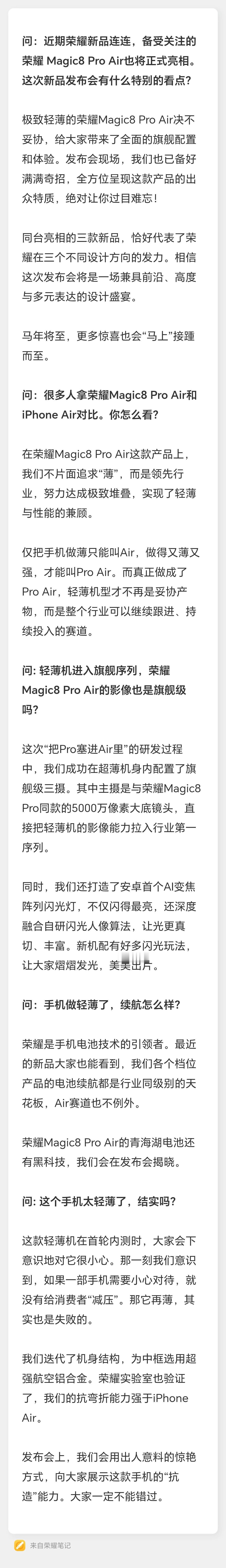 对于即将发售的荣耀新品手机,荣耀产品线总裁方飞发文表示,同台亮相的三款新品,代表了荣耀三个不同设计方向,荣耀Magic8 Pro Air、荣耀Magic8 RSR保时捷设计,那么小伙伴们猜一猜,还有一款新品是什么型号呢?官方会叫做什么名字呢?畅聊数码新品 数码资讯