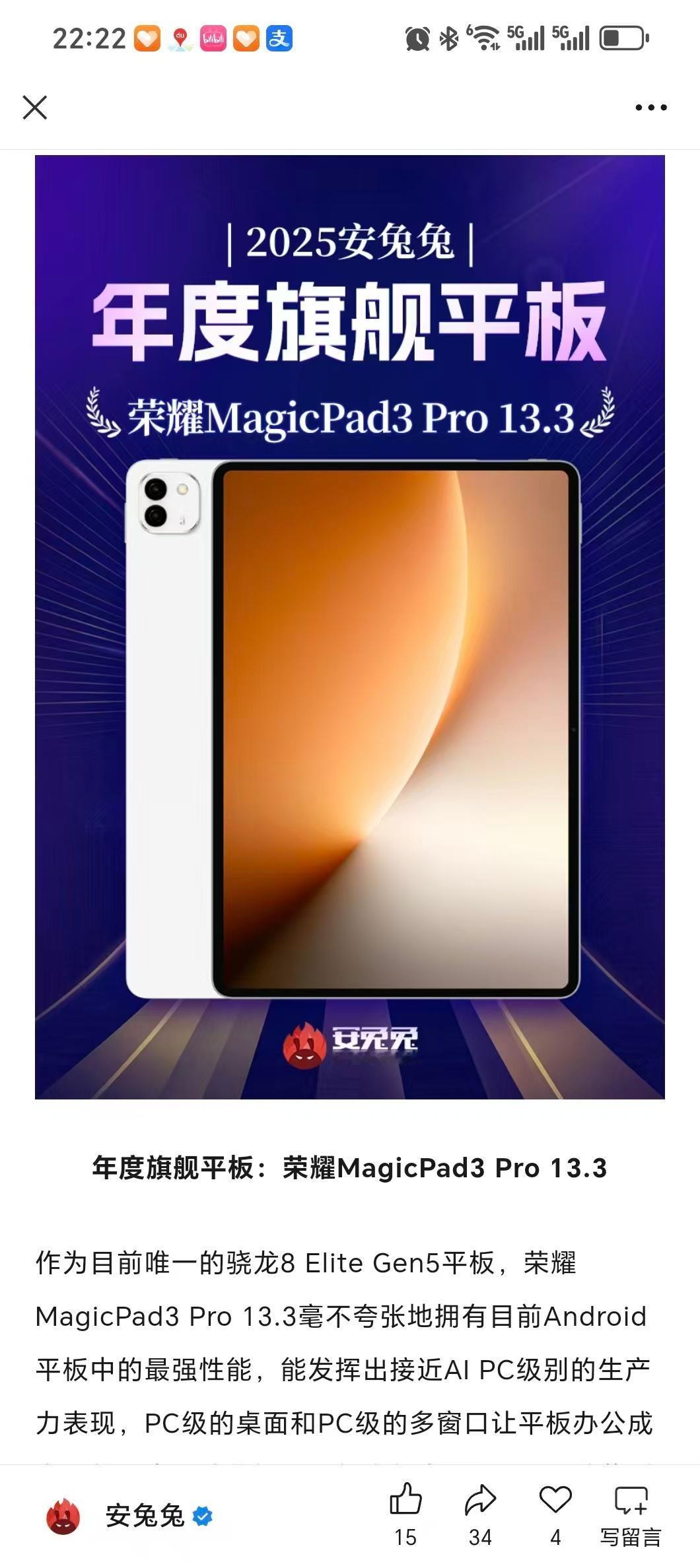 荣耀平板利用哥,分享了荣耀MagicPad3 Pro 13.3,获得了2025安兔兔年度旗舰平板的好消息,利用哥表示,作为目前唯一的骁龙8 Elite Gen5平板,整体性能方面确实蛮强,可以说是现阶段最强的安卓平板产品,尤其是依托荣耀AI PC级别的能力,不光游戏性能蛮好,日常工作、学习也完全靠的住,跨品牌数据互传毫无压力 畅聊数码新品 数码资讯