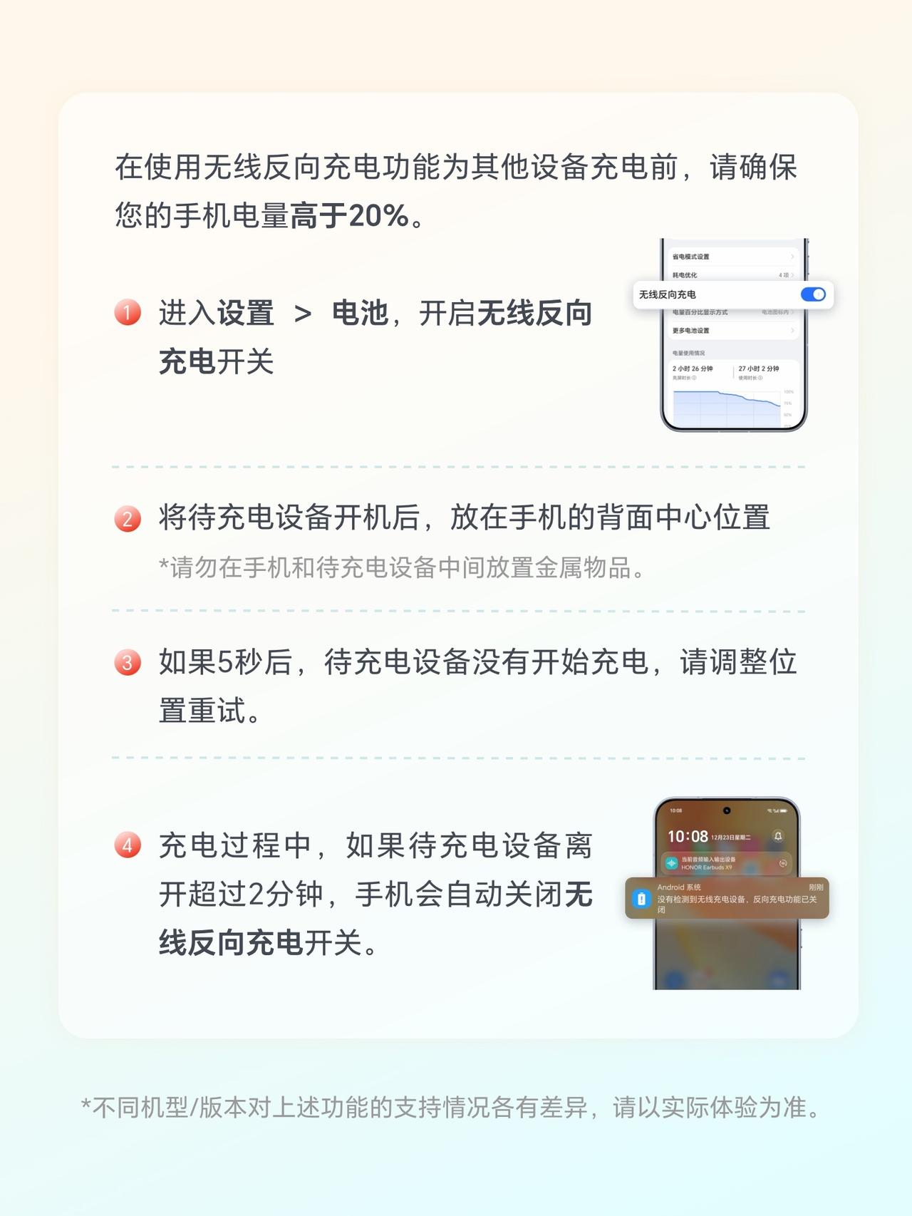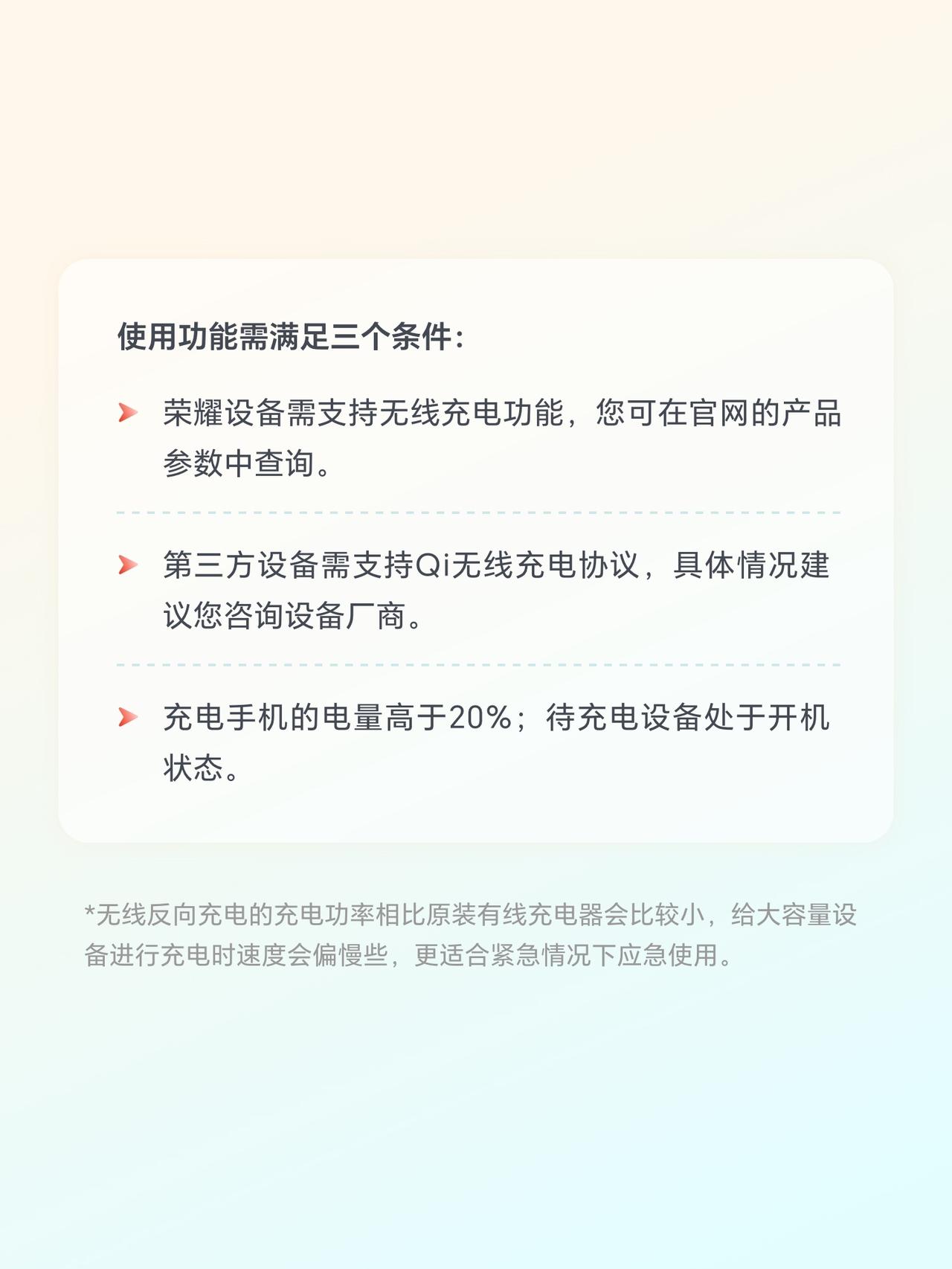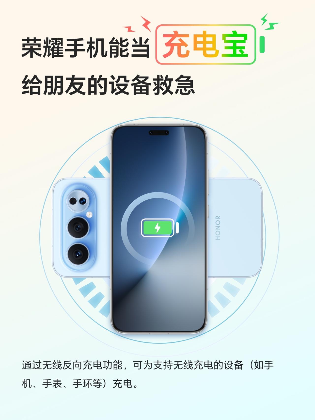 荣耀手机搭载的青海湖电池,最近超过10000mAh已经有好几款型号,出门在外的时候,解决了自己的用电焦虑之后,如何帮助身边的朋友就变成了刚需。荣耀客服刚刚通过一组图文,介绍了荣耀手机如何化身移动充电宝的操作,无线反向充电确实方便许多。 荣耀手机通过无线反向充电的功能,可以将手机作为临时充电宝来使用,可以为为朋友们的各种设备进行救急补电,例如手机、手表、手环等设备进行充电。但是需要注意手机是否支持无线充电功能,第三方设备是否支持Qi无线充电协议,自身设备电量要高于20%。 荣耀MagicOS 10,设置>电池,开启无线反向充电开关,当然也可以尝试有线反向充电。现在只需关注 @超逸谈科技 并转发此微头条,2026年01月20日,将由 选出1位粉丝包邮送出暖暖杯55度礼品装,说不定下一个中奖的就是你哟!抽奖详情