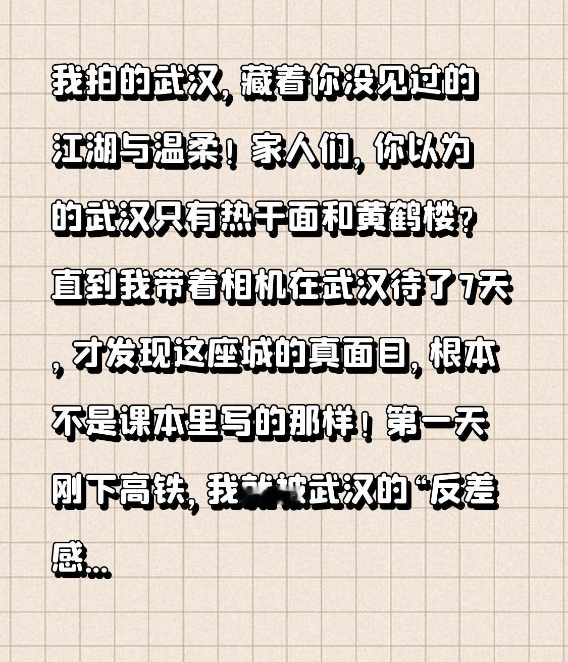 我拍的武汉,藏着你没见过的江湖与温柔! 家人们,你以为的武汉只有热干面和黄鹤楼?直到我带着相机在武汉待了7天,才发现这座城的真面目,根本不是课本里写的那样! 第一天刚下高铁,我就被武汉的“反差感”拿捏了。清晨6点的户部巷,早点摊的炊烟裹着热干面的芝麻香飘满街头,穿睡衣的阿姨端着纸碗蹲在路边嗦粉,摊主一句“多加点辣要不要”的吆喝,直白又亲切。可转身走到长江大桥,晨跑的市民迎着江风奔跑,脚下是奔涌的江水,远处龟山电视塔与黄鹤楼相映成趣,那一刻又觉得这座城辽阔又豪迈。 本以为武汉只有“江湖气”,直到逛到汉口的巴公房子,才算解锁了它的温柔。红砖穹顶下,雕花栏杆泛着岁月的光泽,花砖地板上游客们举着气球拍照,谁能想到这栋百年建筑,如今变成了能住能逛的文化酒店,还藏着万里茶道的旧时光 。隔壁的咸安坊更惊喜,石库门建筑爬满蔷薇,萧红曾住过的老楼旁,咖啡馆和美学馆次第开放,老里份的烟火气和新潮业态居然这么搭。 最让我上头的是武汉的夜!傍晚的江滩公园,放风筝的孩童、跳广场舞的阿姨、散步的情侣随处可见,轮渡的汽笛声混着笑声,江风一吹,白天的燥热全散了。转到光谷步行街,霓虹闪烁的文创市集里,手作人分享着原创首饰的灵感,二次元店铺里藏着限量手办,年轻人们笑着闹着,让整条街都充满活力。而昙华林的夜更有韵味,城墙边的非遗市集上,汉绣团扇、楚剧脸谱书签透着老武汉的韵味,山顶营地的民谣声里,抬头就能望见黄鹤楼的夜景 。 原来武汉从不是单一的模样:它有户部巷早点摊的市井烟火,也有巴公房子的百年风情;有长江大桥的豪迈江湖,也有昙华林的文艺温柔;有老一辈传承的踏实坚韧,也有年轻人追捧的潮流活力。这里的每一条老街、每一碗热干面、每一声“拐子”的招呼,都藏着最真实的生活质感。 你心中的武汉是什么样子?是热干面的香气,还是长江的晚风?评论区聊聊你的武汉记忆,也别忘了点赞收藏,下次去武汉照着逛!