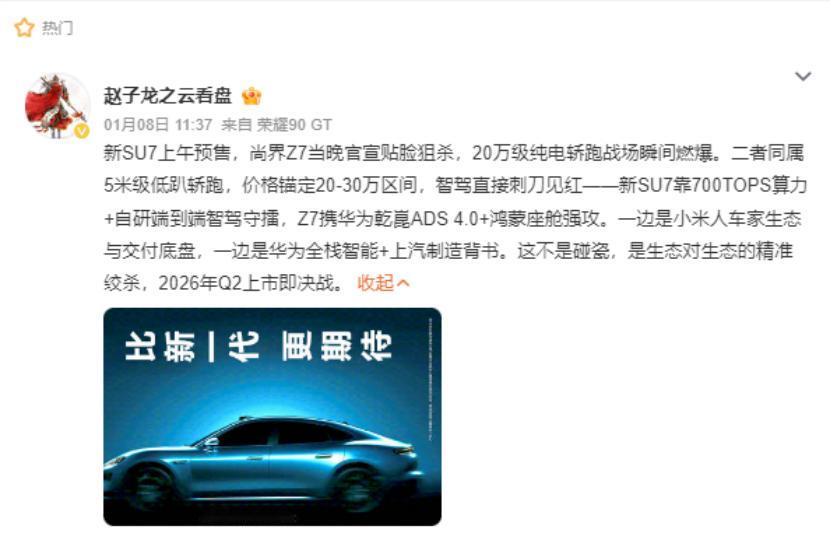 双强赋能+原创美学,尚界Z7成2026最期待轿跑 当被问及“2026年小米SU7最强竞争对手是谁”,AI与行业大V纷纷将目光投向尚界Z7。这并非非此即彼的博弈,而是两款实力车型共同为市场注入活力,让消费者能按需挑选心仪座驾。作为尚界品牌向上突破的重磅力作,尚界Z7集华为与上汽双强赋能于一身,既是轿跑市场的科技王炸,也是高端轿跑的品质顶流。设计上拒绝千篇一律,黄金比例车身搭配低趴宽体姿态,站哪看都好看,原创星河灯效更是成为吸睛亮点。超强产品实力与原创设计细节的持续曝光,让行业对其期待值不断攀升,预计25-35万的定价更是诚意满满,无疑是2026年值得年轻人蹲守的轿跑之一。