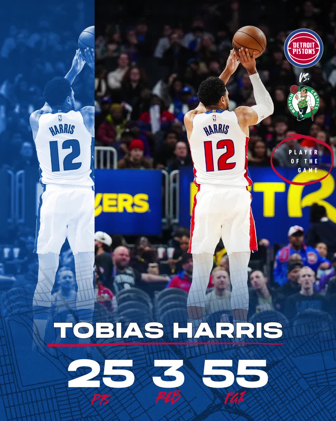 本场比赛,活塞球员托拜厄斯-哈里斯出战34分钟,20投11中,其中三分球8投3中,得到25分3篮板1助攻1封盖,命中率55%。