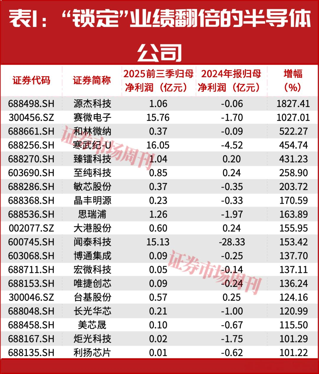 此外,赛微电子2025年前三季度的业绩相对2024年全年增长1027.01%,同样业绩增长翻倍的公司还有和林微纳、寒武纪-U、臻镭科技等(见表1)。需要注意的是,寒武纪-U还是“超级牛散”章建平的重仓股之一,截至2025年三季度末,章建平重仓持有公司近85亿元。