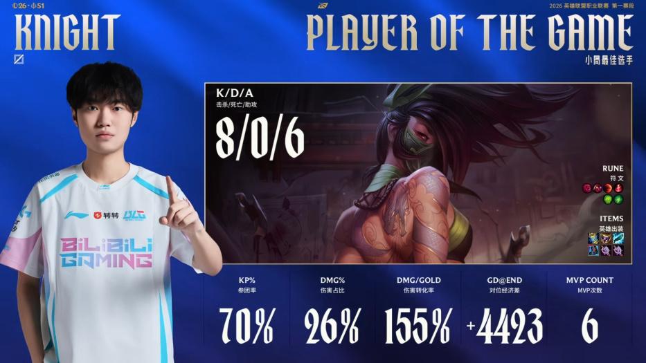 虎扑01月20日讯Knight阿卡丽次局打出8/0/6战绩,今日斩获两连MVP