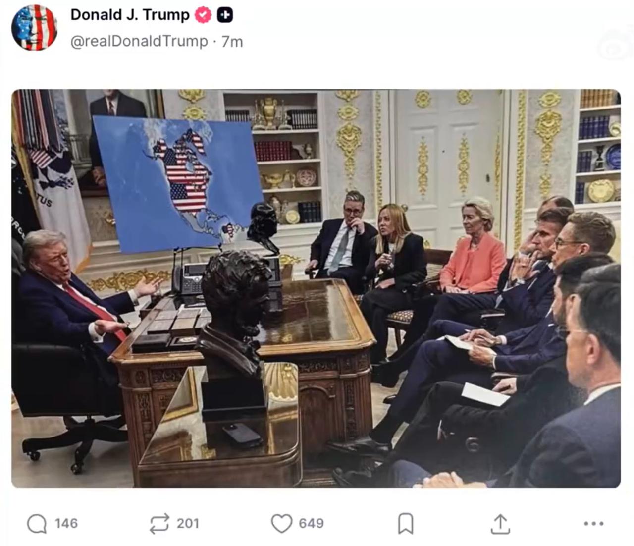 难怪加拿大,会模拟美军入侵,原来川普已经在社交媒体上公开了。 请看图一,这是川普自己发布的图片,注意远处的美国地图。 除了现在的美国,还加上了加拿大和格陵兰,似乎并不违和,而且是连成一片。 你以为这就完了吗? 再看委内入了的位置,也被标成了星条旗。 要我说,美洲还很大,美国还太小,川普需要继续努力。