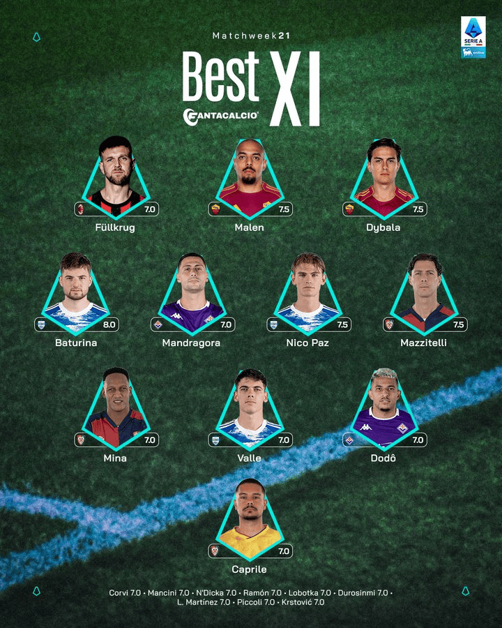 中场:巴图里纳(科莫)、曼德拉戈拉(佛罗伦萨)、尼科-帕斯(科莫)、马齐泰利(卡利亚里)