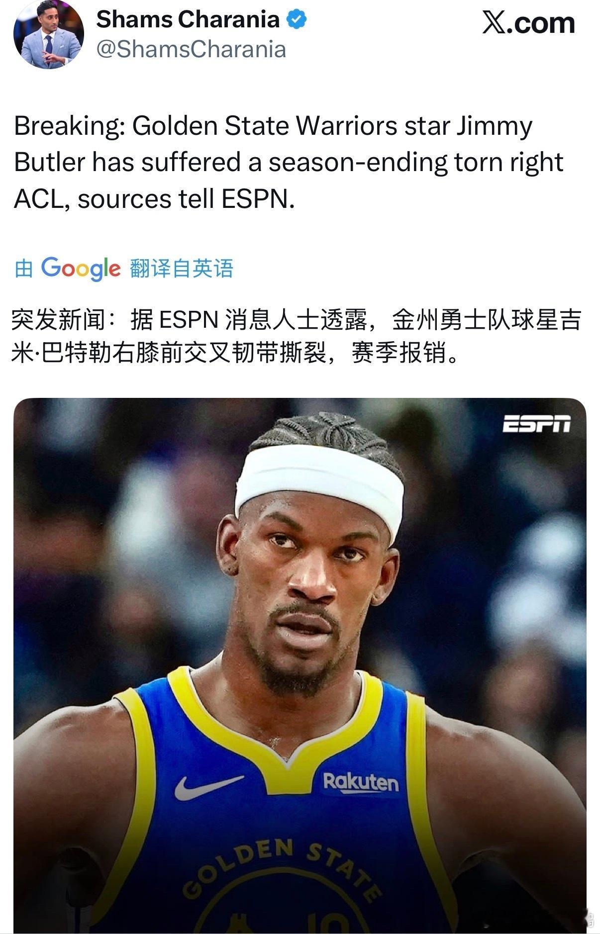 噩耗!勇士真的太难了!刚有起色,就遭重创……2026年1月20日,勇士在主场以一场135比112的大胜热火豪取四连胜。比赛数据堪称华丽!全队50% 的投篮命中率,扔进了16记三分球,送出了30次精妙助攻,将团队篮球演绎到极致。然而,当终场哨响,大通中心却弥漫着一种与胜利极不相称的沉重与寂静。所有人的心,都系在了第三节那个令人揪心的瞬间!巴特勒倒地捂着自己的膝盖……比赛进行到第三节还剩7分41秒,勇士以77-75领先。一次看似平常的进攻配合,却成了整场比赛乃至整个赛季的拐点。巴特勒空切篮下,跃起试图接队友的高吊传球。就在他起跳、与热火后卫发生接触、然后落地的过程中,他的右膝出现了不自然的严重扭曲。他当即痛苦倒地,惨叫声让嘈杂的球场瞬间鸦雀无声。队医和队友迅速围拢,而巴特勒在尝试后发现自己右膝完全无法承重,最终只能在希尔德和小佩顿的搀扶下,一瘸一拐地离开球场。离开时,他脸上仍带着标志性的、略带苦涩的微笑,甚至在倒地后还曾对队友开玩笑说“想罚两个球”,这份乐观反而更让人心碎。赛后最坏的消息还是来了……仅仅几小时后,shams带来了毁灭性的消息:巴特勒遭遇右膝前十字韧带(ACL)撕裂,确定赛季报销。对于一名即将年满37岁的老将来说,ACL撕裂是毁灭性的伤病,通常需要长达一年甚至更久的恢复期。这意味着,勇士花重金引入、寄予厚望的冠军拼图,在本赛季最关键的下半程和季后赛征程中,将彻底缺席。巴特勒的倒下,对勇士而言远不止是失去一名场均20.1分5.6篮板4.9助攻,投篮命中率高达51.9% 的得分手。他的价值,是数据无法完全体现的。其一,他是勇士除库里外,最可靠、最稳定的单打点和关键时刻的硬解法。本赛季,尤其是进入一月后,他场均能高效贡献21.3分(命中率53%),是库里身边最犀利的副攻手。在防守端,他更是能从一防到四的外线大闸,他的经验和强悍是勇士老化防线最需要的硬度。其二,巴特勒为这支“老龄化”的勇士带来了最稀缺的赢家心态和季后赛硬度。他13年职业生涯12次进入季后赛,带领热火两度杀入总决赛的履历,正是渴望再夺一冠的勇士最看重的“冠军DNA”。他的伤退,无异于抽走了球队的“精神脊柱”。其三,勇士管理层本赛季构建了一套以库里、巴特勒、格林为核心,合同期对齐的“最后一舞”阵容。巴特勒的报销,直接宣告了这套争冠计划的破产,球队的建队方向被迫急转弯。金州勇士队巴特勒吉米巴特勒伤病