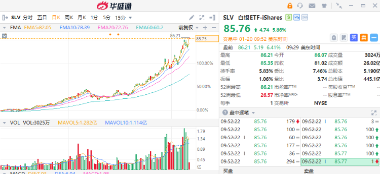 华盛资讯1月20日讯,格陵兰岛危机引发贸易战担忧!金银价格集体创新高,黄金ETF$GLD涨超3.4%,白银ETF$SLV涨近6%。