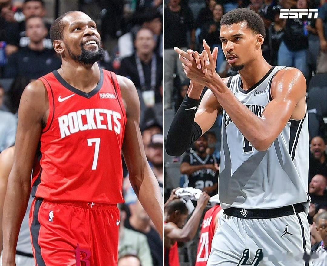 火箭马刺明日比赛预告!二连胜vs三连胜,火箭两大悍将缺席能否复仇?ESPN预测火箭胜率居然高达64%!而马刺只有36%?我都怀疑ESPN是不是搞错了?双方此前一番战马刺赢了11分!火箭这边上场面对鹈鹕!在此前一番战火箭被倒数第一鹈鹕实现25分大逆转!堪称耻辱!而杜兰特也在对阵鹈鹕时打破历史纪录!总得分正式超越诺维斯基升至历史第六!火箭其实本赛季算不上强队,阵容看似豪华,始终漏洞百出,强能赢掘金,弱能输国王鹈鹕!说实话还是缺控卫,且火箭的失误率居然比湖人还高?而马刺这边本赛季是真的强!尤其是文班亚马最近真的杀疯了!226cm的高炮台库里!在剃完光头的少林武憎近三战三分合计27投16中,太变态了!关键时刻各种硬解!联盟到底谁能限制文班?本赛季马刺只要保持健康,季后赛保底二轮起步!而文班就是他们的上限!本赛季三杀雷霆,联盟霸榜扫雷高手!双方近5战及总战绩:马刺3胜2负,30胜13负西部第二火箭3胜2负,25胜15负西部第五双方预测首发:火箭—杜兰特,申京,奥科吉,史密斯,汤普森马刺—文班亚马,巴恩斯,尚帕尼,卡斯尔,福克斯双方伤病名单:火箭这边—伊森(右斜肌拉伤)出战成疑!亚当斯(脚踝扭伤)缺席!马刺这边——瓦塞尔(左内收肌拉伤)英格拉姆,乌穆德,琼斯(双向合同)缺席!双方攻防数据:火箭进攻效率3,防守效率7马刺进攻效率8,防守效率3火箭马刺文班亚马杜兰特