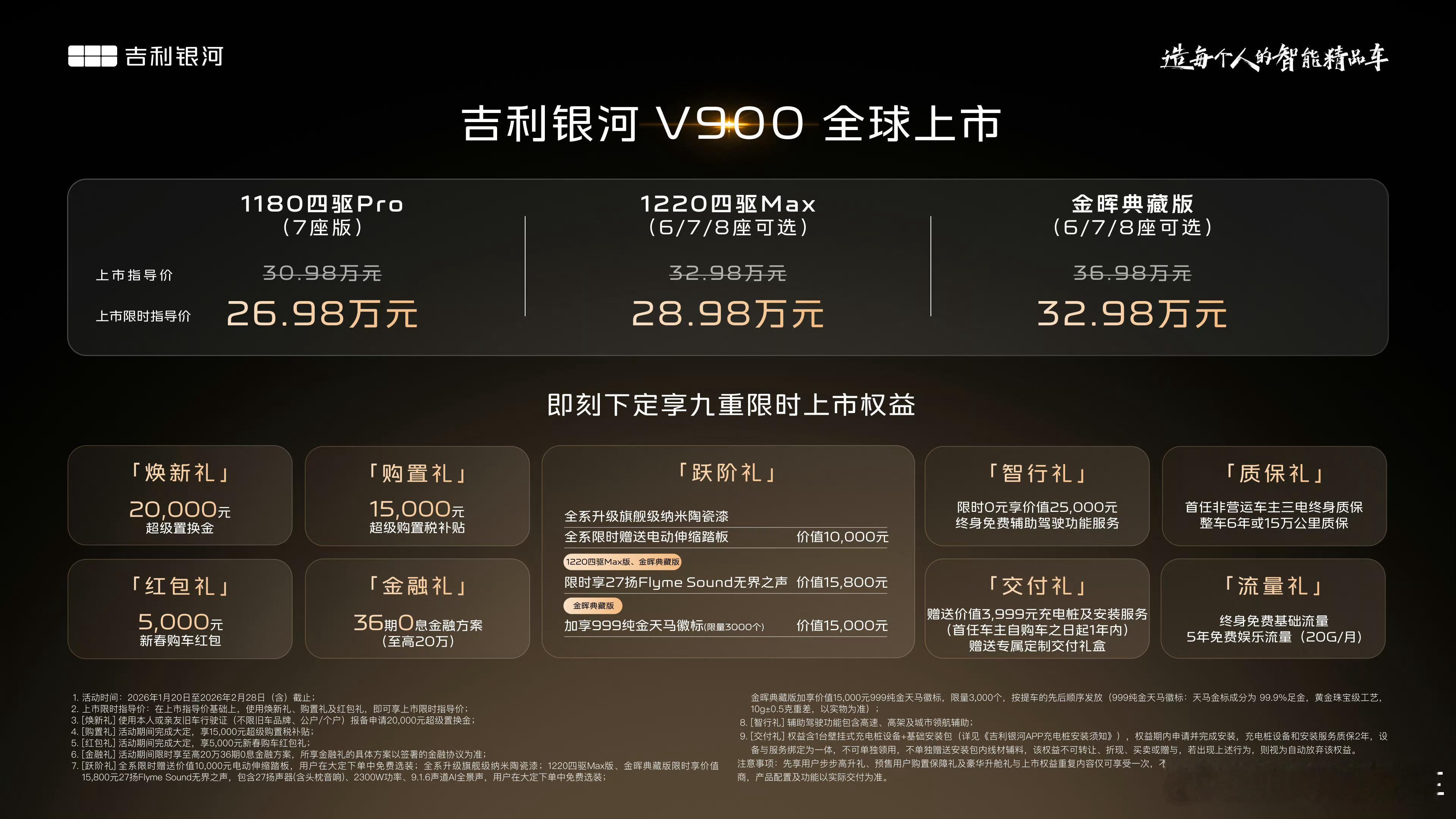 吉利银河V900这回杀疯了!26.98万起!什么概念?这可是车长超5.3米的MPV!首批金晖典藏版大定车主送价值万元的10g纯金天马徽标~满配堆料还送黄金,这波诚意直接拉满上市形式也是很有创意,联合综艺《一饭封神》,会玩!吉利银河V900全球上市26.98万起 呼伦贝尔