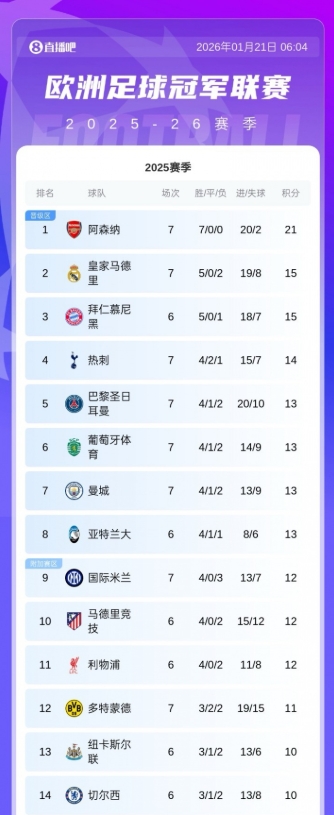 直播吧01月21日讯欧冠联赛阶段第7轮战罢,热刺2-0力克多特,成功攀升至积分榜第四。球队在本届欧冠联赛阶段7轮4胜2平1负。