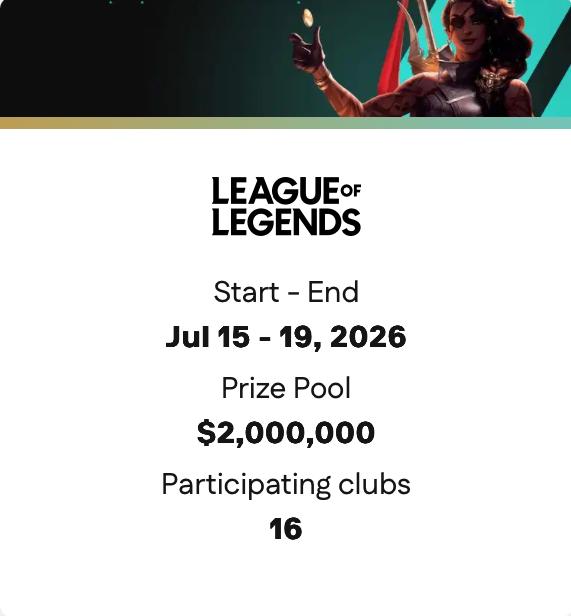 虎扑01月21日讯EWC官网更新2026EWC信息,英雄联盟项目扩军至16队,奖金池仍为两百万美元,具体时间为2026年7月15日-19日。
