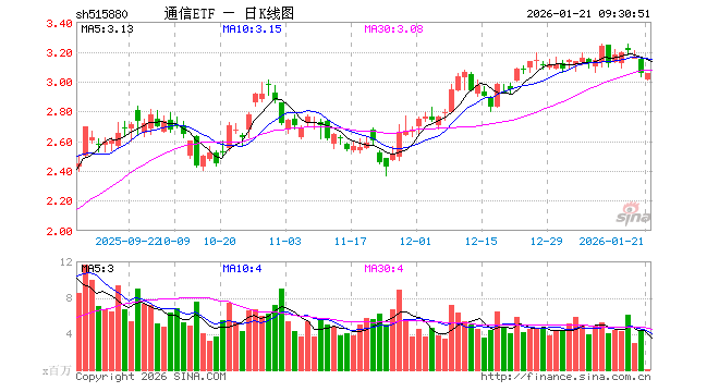 1月21日,通信ETF(515880)开盘跌1.50%,报3.011元。通信ETF(515880)重仓股方面,新易盛开盘涨0.12%,中际旭创涨0.21%,工业富联跌1.61%,中兴通讯跌0.98%,天孚通信跌0.41%,中天科技跌1.56%,亨通光电跌1.84%,传音控股跌0.05%,闻泰科技跌0.56%,剑桥科技跌0.28%。