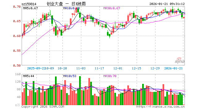 1月21日,创业大盘ETF(159814)开盘跌0.45%,报0.659元。创业大盘ETF(159814)重仓股方面,宁德时代开盘涨0.67%,中际旭创涨0.21%,东方财富跌0.04%,新易盛涨0.12%,阳光电源涨0.06%,胜宏科技跌0.24%,汇川技术跌0.29%,迈瑞医疗跌0.05%,亿纬锂能跌0.50%,天孚通信跌0.41%。