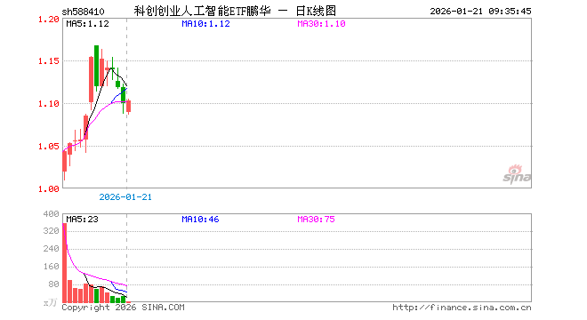 1月21日,科创创业人工智能ETF鹏华(588410)开盘跌0.91%,报1.089元。科创创业人工智能ETF鹏华(588410)重仓股方面,中际旭创开盘涨0.21%,新易盛涨0.12%,澜起科技涨0.70%,寒武纪跌0.57%,金山办公跌0.30%,芯原股份跌1.22%,润泽科技跌1.71%,北京君正涨0.00%,昆仑万维跌0.68%,协创数据跌0.67%。