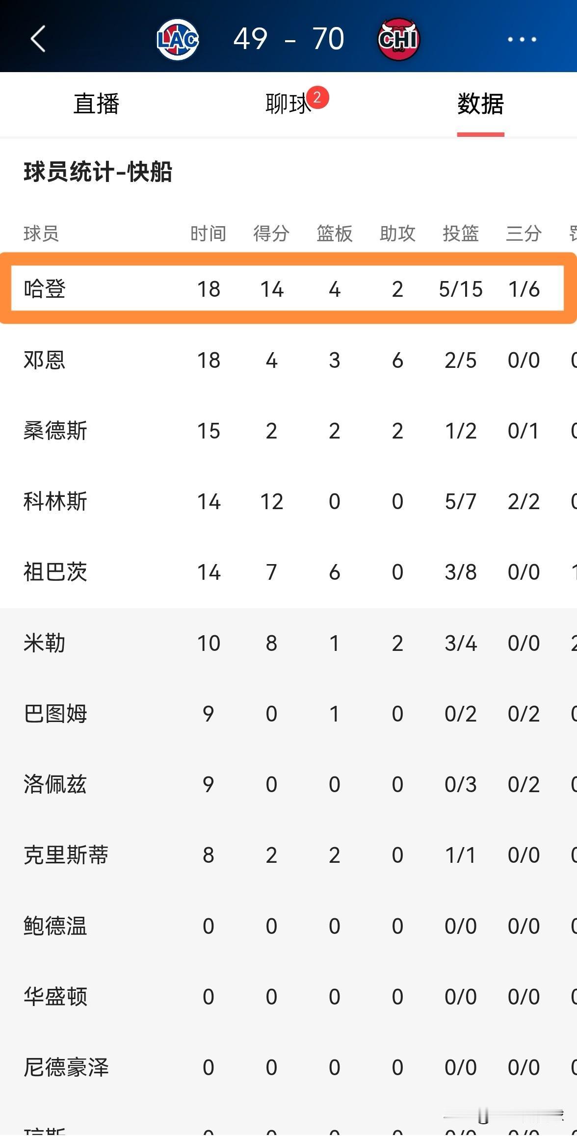 我对快船巨星哈登真是彻底的失望了!在今天快船客场挑战公牛的比赛中,目前双方半场战罢,快船以49:70落后对手21分,形势看起来一片糟糕。在前两节比赛中,哈登的进攻效率真是非常低效,他在首发出战的18分钟里,投篮15中5,其中三分球6中1、罚球3中3得到14分,还出现了4次失误,他的场上正负值为-8。 毫不客气的说,以哈登目前的糟糕状态和双方的分差来看,哈登完全没必要在下半场比赛中出场。