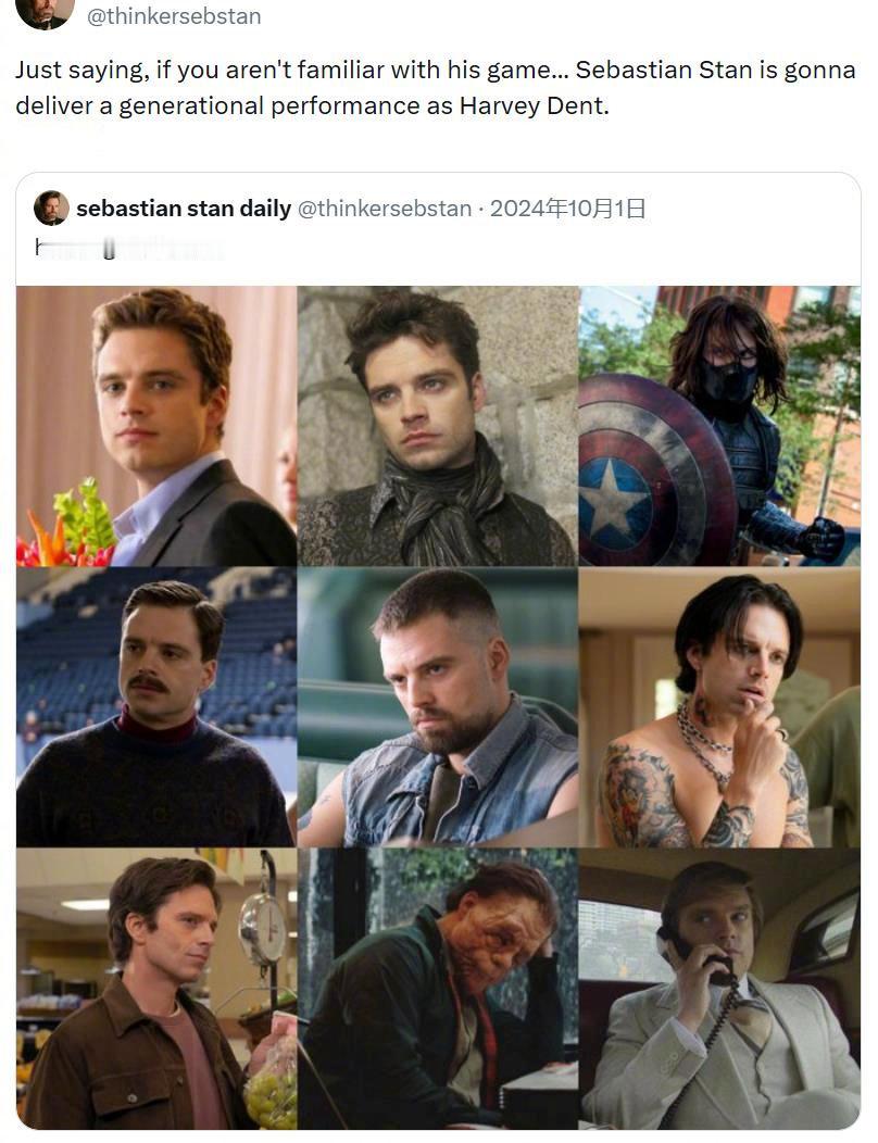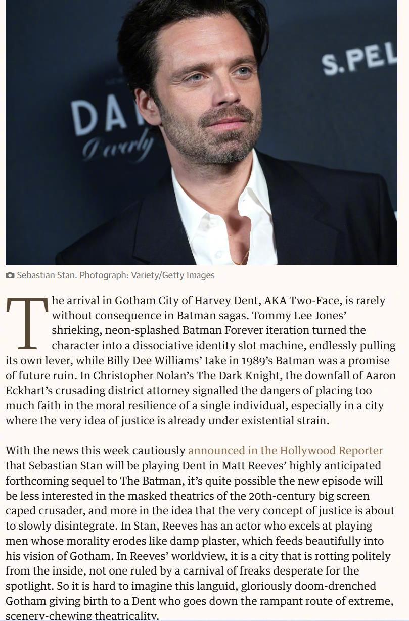 《卫报》等外媒对Seb在《新蝙蝠侠2》中出演"双面人”的评论(演技夸夸党上线):“塞巴斯蒂安·斯坦是哈维·丹特的最佳人选,里夫斯终于找到了一位擅长演绎道德感如潮湿的石膏般逐渐崩塌的演员,这完美契合了他对哥谭的构想。”.CBR和SlashFilm等媒体也表达期待:“Harvey Dent在成为[双面人]之前,是极具魅力与理想主义的人物。特别是对复杂角色层面的塑造能力,一定能让观众为之倾倒。”.“他既能塑造《热浴盆时光机》中夸张混乱的反派,也能演出《新鲜》中的那种不动声色的狡诈阴险... 他非常擅长演绎充满内心冲突的角色,这也是Bucky Barnes深受影迷喜爱的原因。” .384出演双面人 跨年电影愿