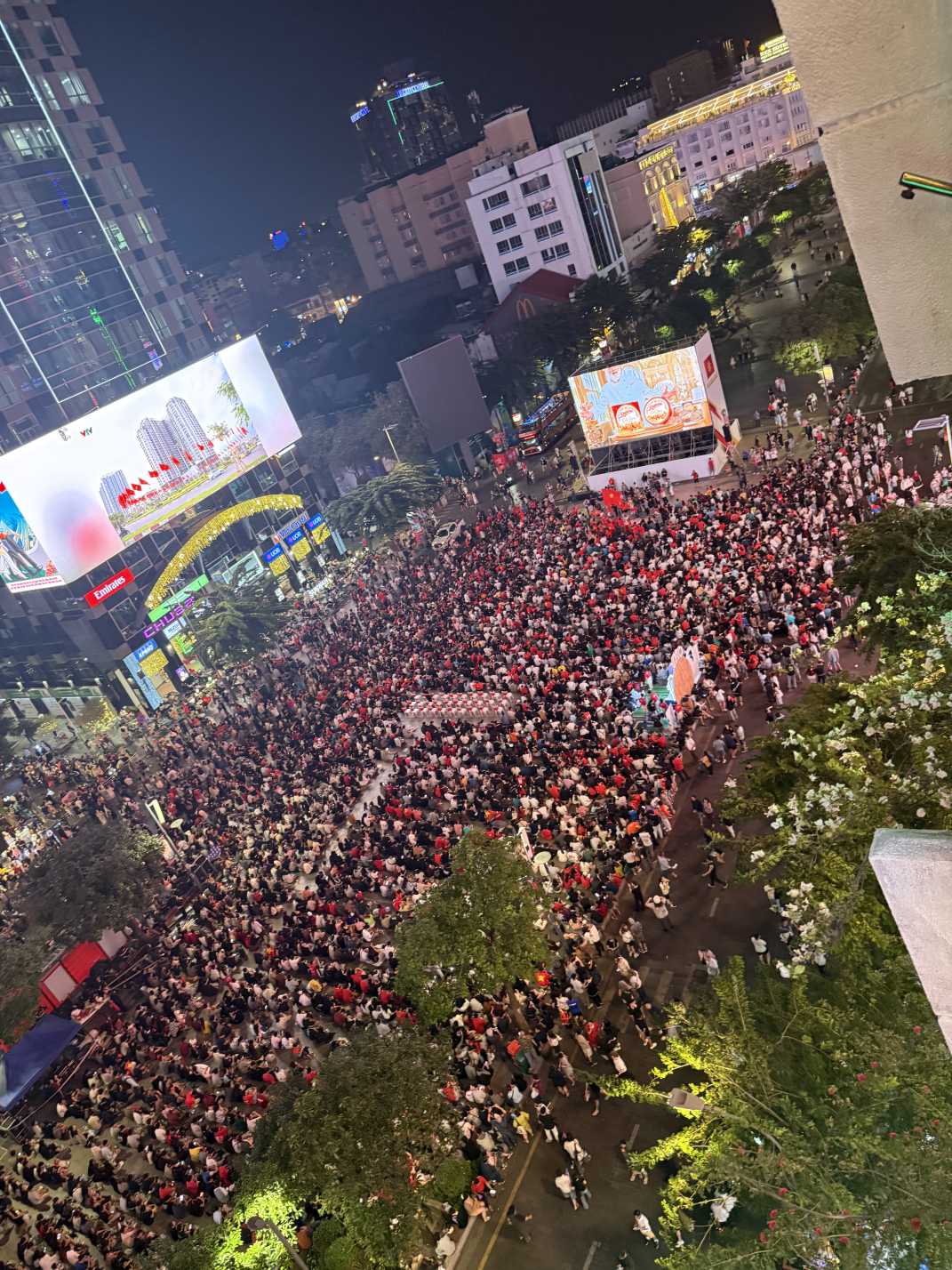 随着中越之战来临,越南球迷身披红色国家队球衣、手持国旗,在广场上汇聚成一片红色的海洋,可谓“万人空巷”。空气中弥漫着呐喊、歌声与统一的助威节奏,整个城市的心跳仿佛都与比赛同频共振。