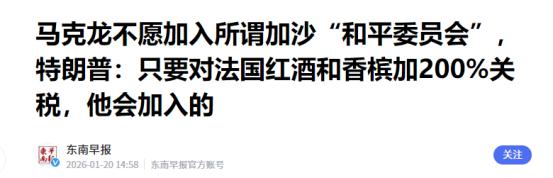 特朗普回应马克龙不加入和平委员会:对法国红酒和香槟加征200%关税,他会加入的,但没人在乎 当地时间 1 月 19 日深夜,特朗普面对记者提问时的这番话,把美式霸权的蛮横与滑稽暴露得淋漓尽致。问题的由头,是法国总统马克龙明确拒绝加入他牵头搞的所谓加沙 “和平委员会”,可这位美国前总统的回应既不是摆事实讲道理,也不是协商沟通,直接掏出了 “关税大棒”,扬言要对法国红酒和香槟下狠手。 这事得从那个透着诡异的 “和平委员会” 说起。上周特朗普突然宣布要搞这么个组织,还给 60 多个国家和国际组织发了邀请,一副 “全球和平我说了算” 的架势。 但明眼人一看就知道不对劲,法国总统办公室直接点破了要害:这委员会压根不是为了真正解决加沙问题,而是特朗普想自己当主席,把权力扩大到加沙过渡治理之外,说白了就是要架空联合国。 想想也不奇怪,美国这些年在巴以问题上早就没了公信力,安理会里一味偏袒以色列,动辄一票否决国际社会的决议,把联合国的作用削得只剩个空架子,现在趁机推出 “美式解决方案”,无非是想把自己的利益包装成 “和平诉求”。 马克龙不加入,本质上是不愿当这个 “陪衬”。接近他的消息人士早说了,法国根本没打算接这个邀请。 毕竟谁愿意跟着一个只想搞 “一言堂” 的人瞎折腾?更何况欧洲各国对这个委员会本来就满腹疑虑,不少收到邀请的国家都憋着不表态,没人想公开支持这种绕过联合国的做法。马克龙敢第一个明说 “不”,其实是戳破了特朗普的 “皇帝新衣”,你这所谓的 “和平倡议”,根本没得到真盟友的认可。 被拒之后,特朗普的反应堪称 “霸权式撒泼”。他先是嘴硬 “没人想要他加入,因为他很快就要卸任了”,转头就露出了獠牙,把法国红酒和香槟当成了 “人质”。 可这招早就不是什么新鲜花样了,就在几天前,他还因为格陵兰岛的事威胁要对法国、德国等 8 个欧洲国家加征关税,当时欧洲就炸了锅,骂他用的是 “黑手党式手段”。法国红酒这事儿更像是旧戏重演,只不过这次的借口从 “买岛” 换成了 “和平”,本质都是用经济胁迫对付盟友。 但特朗普显然忘了,欧洲早就不是任人拿捏的软柿子了。马克龙团队已经放话,要是真加征关税,就请求欧盟启动反胁迫工具,这可是被称为贸易 “火箭筒” 的狠招,虽然从没用过,但一旦启动,能直接对美国企业搞市场限制、金融制裁,甚至暂停专利许可。 欧盟更早就憋着一股火,之前针对格陵兰岛的关税威胁,已经在酝酿对 930 亿欧元美国商品加税的反制清单,现在特朗普又来招惹法国,等于往枪口上撞。 更有意思的是特朗普那套自相矛盾的逻辑:一边说 “没人想让马克龙加入”,一边又急着用关税逼他就范,最后还补一句 “没人在乎他来不来”。这根本不是 “不在乎”,而是 “输不起”。 自己牵头的组织被核心盟友打脸,只能用威胁来撑场面,反而暴露了美国的尴尬,现在想拉着盟友做事,已经没人愿意真心配合了。这种 “胡萝卜没有,大棒硬挥” 的套路,早把跨大西洋关系凿得千疮百孔。 美国国内对这出闹剧也骂声一片。参议院民主党领袖舒默直接说这行为 “令人难以置信”,要提法案阻止;连共和党议员都觉得震惊,参议员穆尔科夫斯基直言这关税 “不必要又具惩罚性”,只会把盟友推得更远。 毕竟谁都清楚,法国红酒和香槟在美国市场一直很受欢迎,加征 200% 关税,最后买单的还是美国消费者,这种 “伤敌一千自损八百” 的蠢事,连自己人都看不下去。 嘴硬 “没人在乎”,暴露的是内心的底气不足。特朗普可能觉得关税是万能的,但欧盟已经放出话了,“理智的美国人也知道,他刚刚打开了潘多拉的盒子”。 更值得琢磨的是,这种 “对盟友动粗” 的做法正在一点点瓦解美国的同盟体系。欧洲议会早就呼吁要放弃对美国的依赖,建立自己的 “可信威慑”。这次法国红酒的争端,说不定会成为压垮美欧信任的又一根稻草。 毕竟谁也不想跟一个动不动就拿经济威胁当武器的 “盟友” 打交道,今天能对红酒下手,明天就能对汽车、农产品开刀,这种毫无底线的胁迫,早晚会让盟友彻底心寒。 现在的局面很讽刺:特朗普想靠关税逼马克龙低头,结果可能把整个欧盟都逼成对手;想靠 “和平委员会” 彰显美国影响力,结果暴露了自己的孤立无援。这哪是 “领导世界”,分明是在给自己树敌。 美式霸权的那套逻辑,早就跟不上现在的世界了,靠威胁换不来尊重,靠强权换不来认同,真要想解决加沙问题,不如先放下关税大棒,好好听听联合国和国际社会的声音。 可特朗普显然没搞懂这个道理,还在演着 “谁不服就打谁” 的旧戏码,只不过这次,没人愿意再当他的观众了。