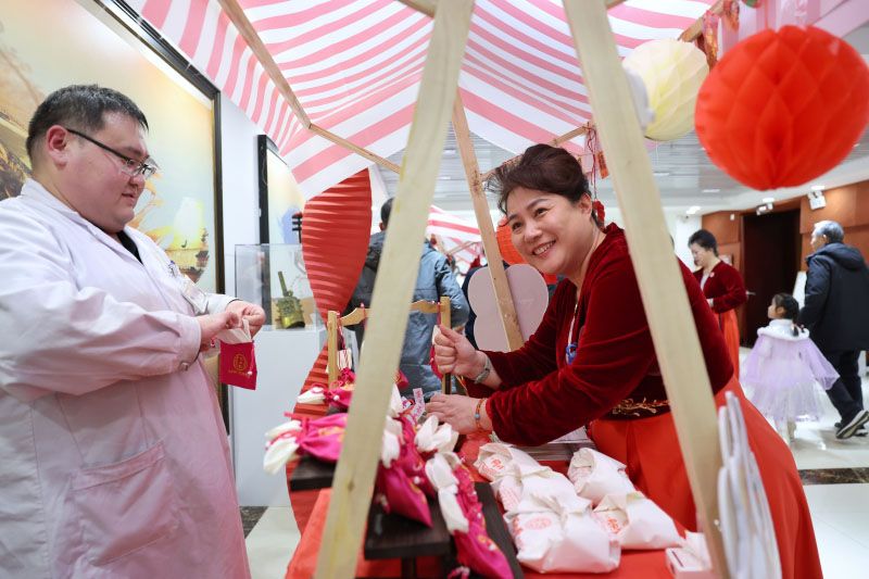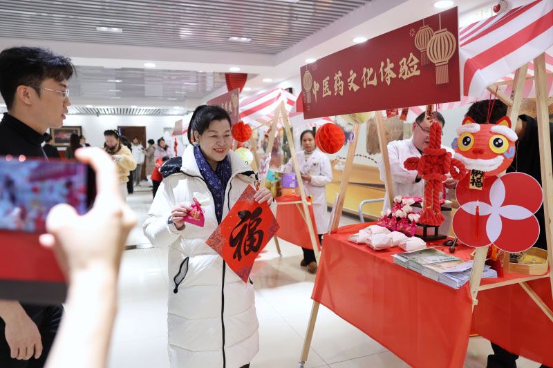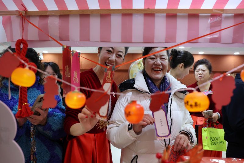 市民举着刚领到的福字逛文化市集。