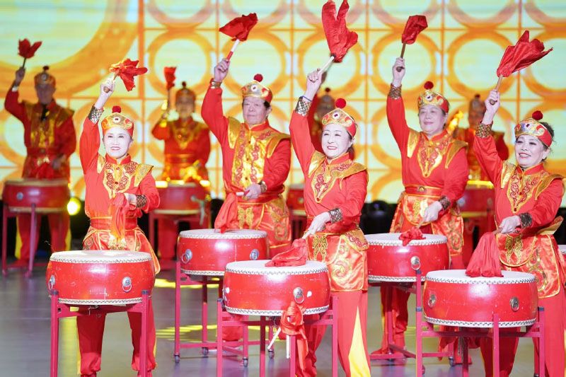 1月20日晚,什刹海街道第二十一届文化嘉年华在西城区缤纷剧场开启。图为锣鼓队表演热闹开场。