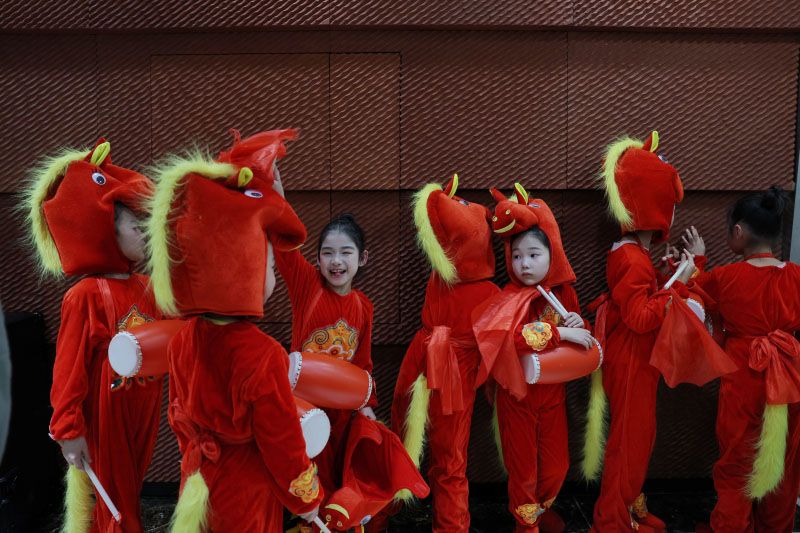 装扮成小红马的演员们候场。