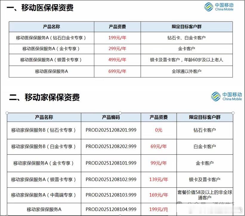 【中国移动也开始卖保险了!】中国移动面向存量用户推出的医疗保障类权益产品“移动医保保”,按年收费,有199元、299元、499元、699元等多个档位,可以搭配门诊报销、意外保障、住院医疗等服务,线上问诊和购药也可以按比例理赔。“移动家保保”则类似是一款家财险产品,可以应对常见的猫抓狗咬、运动摔伤等意外医疗以及家庭财产因火灾、水管爆裂等导致的损失,产品资费有0元、69元、99元、139元、169元等多个档位。中国移动通过旗下有中移(深圳)保险经纪有限公司,把保险卖进自己的用户体系里。中国移动目前还是招商仁和人寿第二大股东。