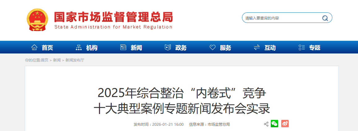 1月21日上午,市场监管总局召开2025年综合整治“内卷式”竞争十大典型案例专题新闻发布会。以下为发布会文字实录:
