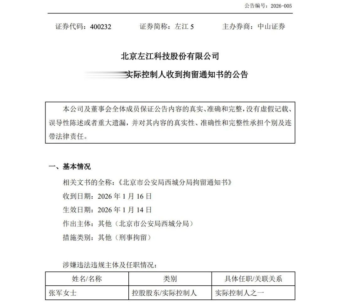 近日,退市公司左江5(原“*ST左江”“左江科技”)公告称,公司近日收到实际控制人张军的家属通知,张军家属于2026年1月14日收到北京市公安局西城分局对张军涉嫌违规披露、不披露重要信息罪的《拘留通知书》,张军现被羁押在北京市西城区看守所。