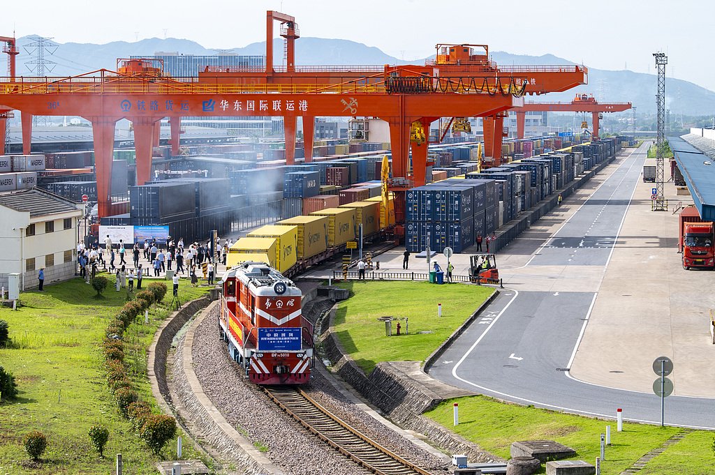 向西,浙江中欧班列(义新欧)依陆出境。金华(义乌)获批成为全国14个中欧班列集结中心之一,浙江中欧班列完成双平台融合,开通26条运行线路,辐射亚欧大陆50多个国家、160余座城市,2025年开行量突破3000列(折算列)大关,同比增长14.8%。