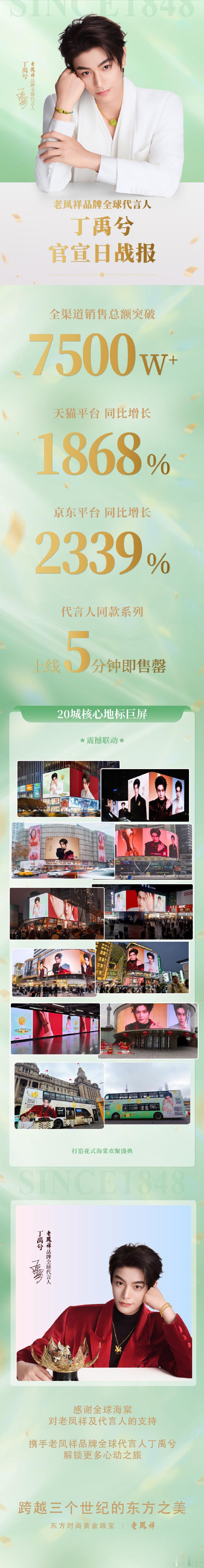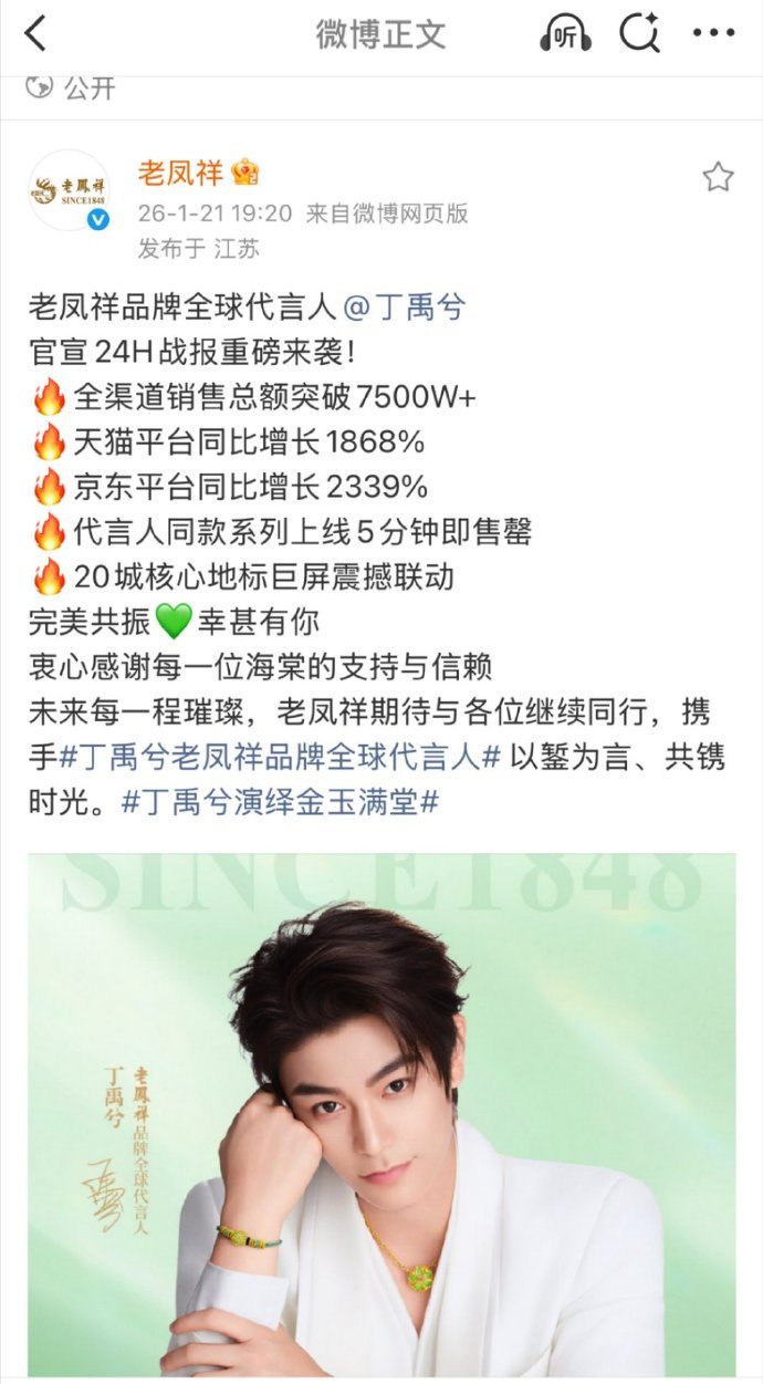 丁禹兮官宣老凤祥销量战报来了,24小时销售额破7500万,官宣日多渠道同比增量1