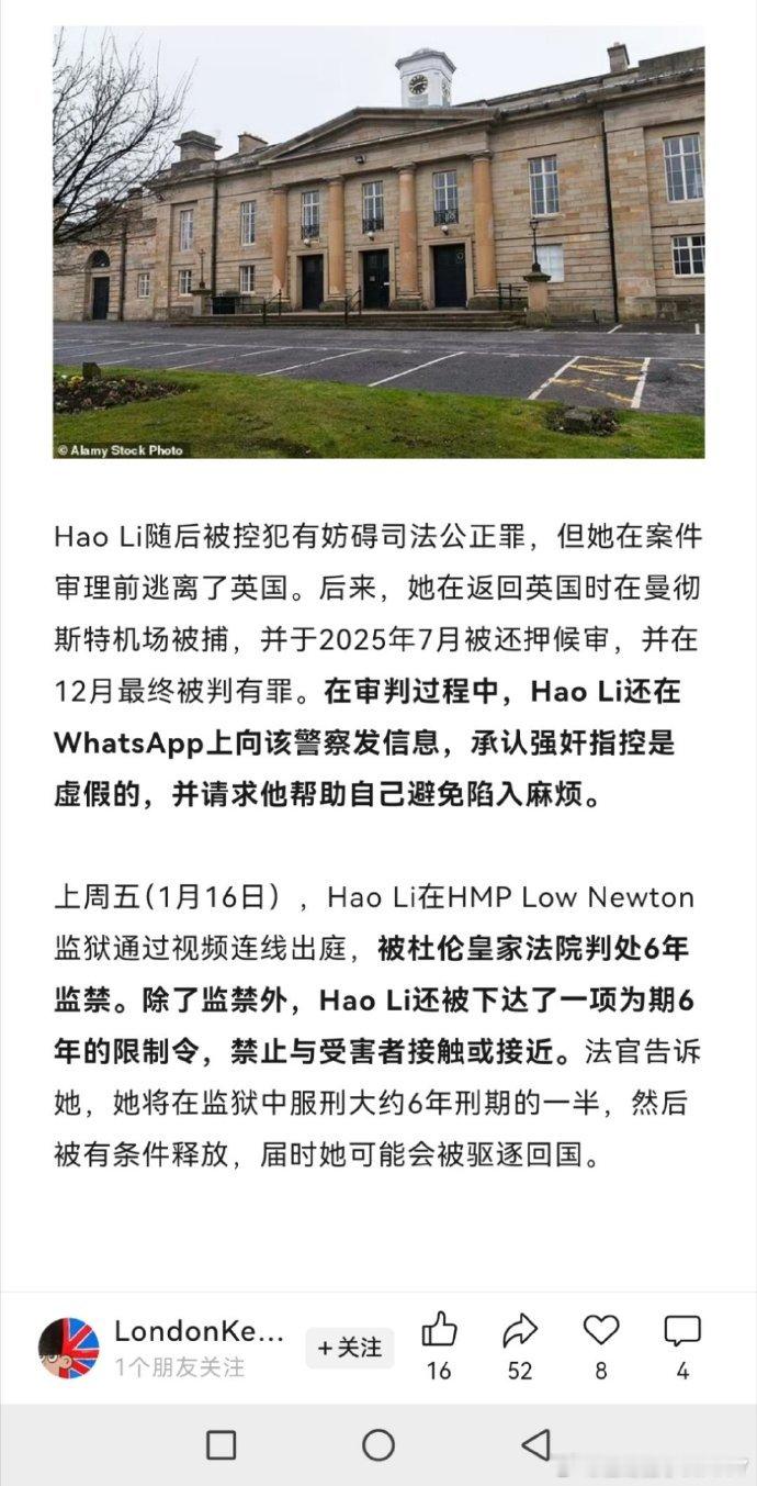 桂哥评:该警察幸亏有发生关系期间的录音,真相才得以大白。这位诬告强奸的女留学生,被判刑6年! 咱觉得这个咱们应当与国际接个归。另外,这个警察发生关系的时候,能够机智的录音,这就厉害了。这个值得学习,小伙伴们一定要保护好自己。===中国女留学生诬告强奸被英国判刑6年!还面临驱逐出境。据英媒1月18日报道,29岁的中国留英学生Hao Li因编造虚假强奸指控而被判刑,并被告知可能面临被驱逐出境的风险。据杜伦皇家法院提供的信息,Hao Li是一名留英硕士,曾在2024年11月“主动”与一名英国警察发生关系。这位警察当时并未执勤,之后开车送Hao Li回家,随后Hao Li报警指控他强奸,警察在半小时后在车内将其逮捕。该警察被逮捕并关押了35小时,随后被停职5个月。之后,该警察提供了在两人发生关系期间录下的对话,才避免被起诉。Hao Li随后被控犯有妨碍司法公正罪,但她在案件审理前逃离了英国。后来,她在返回英国时在曼彻斯特机场被捕,并于2025年7月被还押候审,并在12月最终被判有罪。在审判过程中,Hao Li还在WhatsApp上向该警察发信息,承认强奸指控是虚假的,并请求他帮助自己避免陷入麻烦。上周五(1月16日),Hao Li在HMP Low Newton监狱通过视频连线出庭,被杜伦皇家法院判处6年监禁。除了监禁外,Hao Li还被下达了一项为期6年的限制令,禁止与受害者接触或接近。法官告诉她,她将在监狱中服刑大约6年刑期的一半,然后被有条件释放,届时她可能会被驱逐回国。英国法院判中国留学生诬告警察强奸获刑6年