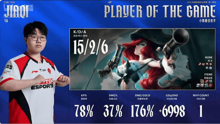 JiaQi女枪打出15/2/6战绩,拿到TES对阵IG首局比赛MVP