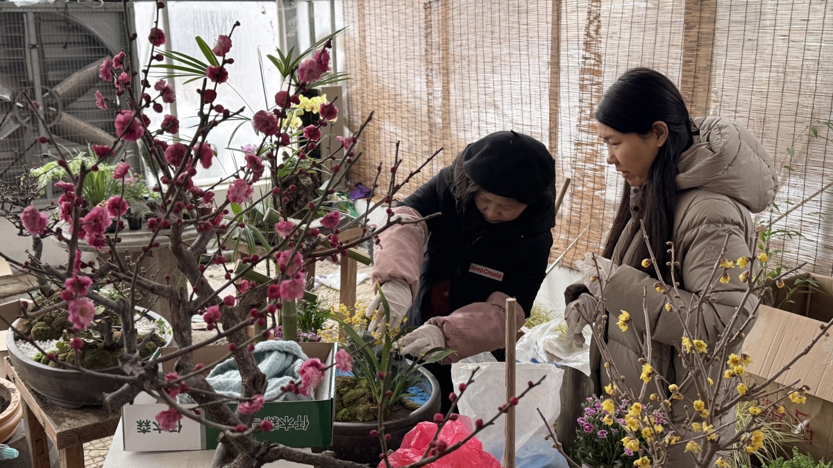 展览核心亮点在于空间设计的创新呈现。通过精心打造的长约10米的梅花地景,巧妙融合园林造景手法,将梅花盆景与古典窗景元素有机衔接,形成“步移景异、景中含画”的观展体验。在布展特色上,通过红梅、蜡梅与窗景的相映成趣,既营造了新春佳节的喜庆氛围,又传递了梅花傲雪迎春的传统寓意,为市民游客带来视觉与文化的双重体验。