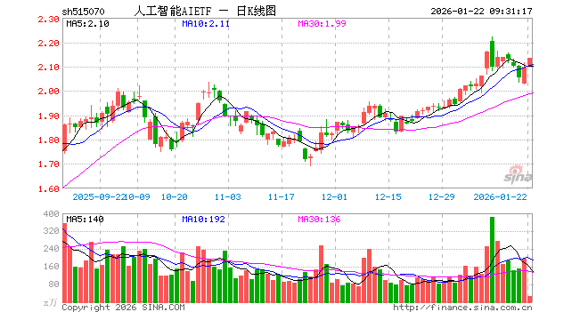 1月22日,人工智能AIETF(515070)开盘涨0.43%,报2.104元。人工智能AIETF(515070)重仓股方面,新易盛开盘涨0.12%,中际旭创涨1.41%,寒武纪跌0.73%,澜起科技涨8.03%,中科曙光涨2.82%,科大讯飞涨0.88%,豪威集团涨0.67%,海康威视涨0.31%,浪潮信息涨1.41%,金山办公涨0.53%。