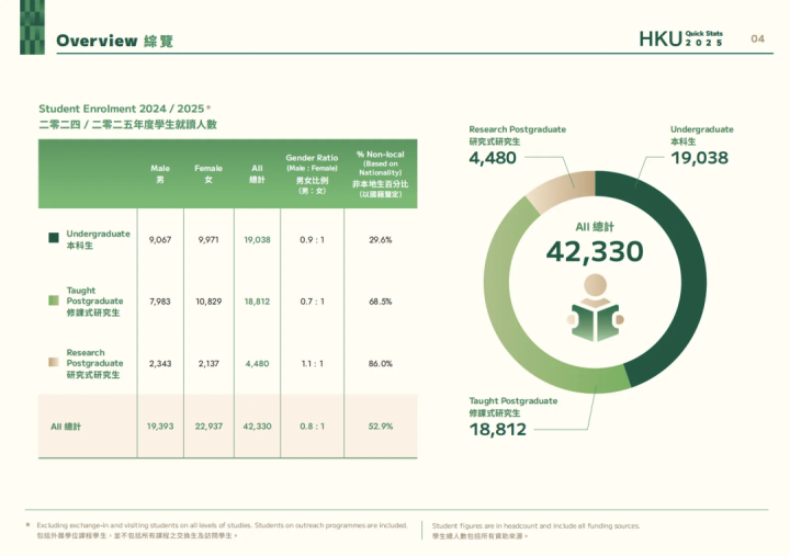 前不久,香港大学官方发布了《2025年度本科招生报告》,其中显示,在2024/25学年,港大非本地生人数持续增长,其中本科生为19038人,较前一年的18491人增加了547人。在港大的所有本科学生中,非本地生比例高达29.6%。