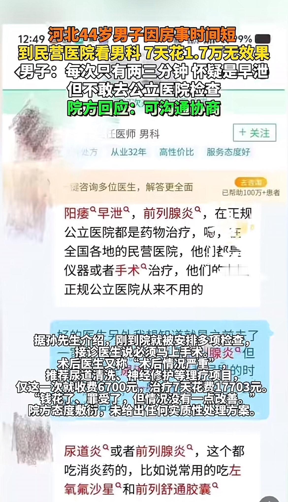 44岁的河北保定市民孙先生,这几年被“房事时间短”困扰,每次大概就两到三分钟,他怀疑自己早泄,却不敢去公立医院检查。2025年10月,他通过保定京济医院微信客服咨询后去就诊。刚到院就被安排多项检查,还被要求马上手术,术后又被告知“情况严重”,推荐理疗项目,一次就收6700元。7天下来,孙先生花了1.7万多却毫无效果。后来网络问诊三甲医院,医生说根本不用手术和仪器治疗。这民营医院真是坑人,大家看病还是别害羞,去正规公立医院才靠谱。