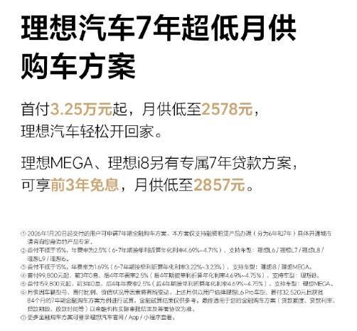 1月20日,理想汽车也发文称,2026年1月20日起购车,可享7年超低月供购车方案:首付3.25万元起,月供低至2578元。