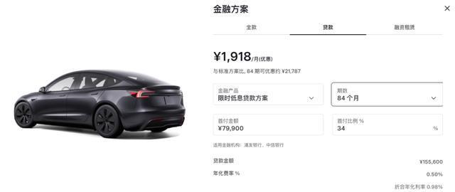 特斯拉也于1月6日宣布,Model3/Y/YL首次推出“7年超低息”,月供低至1918元。其官网显示,1月31日(含)前下订,可申请最长7年超低息购车方案;年费率低至0.5%,折合年化利率0.98%。以此估算,贷款10万元一年利息为500元。