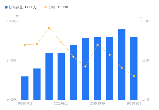 日期A股户数(户)流通A股户均持股数(股)户均持股市值(万元)2026-01-2014800010633.1316.302025-12-3114800010633.1316.092025-12-2014900010561.7616.242025-11-2014800010633.1316.782025-10-2014800010633.1317.112025-09-3014790210640.1716.412025-09-1914700010705.4616.832025-09-1014600010778.7917.442025-08-2914600010778.7917.892025-08-0814400010928.4917.61