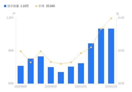 日期A股户数(户)流通A股户均持股数(股)户均持股市值(万元)2026-01-20110196067.0212.702026-01-09110196067.0212.122025-11-2096716912.6812.662025-10-3178538512.9915.142025-10-2075428864.0315.022025-10-1070569474.5615.922025-09-3075048908.9215.132025-09-1084797884.4814.152025-08-2982788075.9213.672025-08-0876248768.6915.75