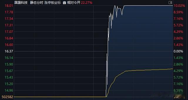 1月22日,国晟科技(603778)一字跌停板开盘,午后13时18分左右跌停板打开,随即开始直线拉升封涨停板,至收盘股价报收18.01元,涨幅10.02%。