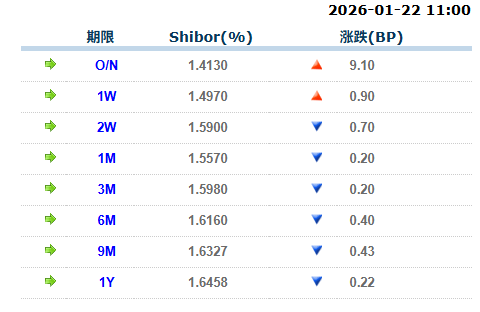 上海银行间同业拆放利率(Shibor)隔夜品种上行近10BP。具体来看,隔夜Shibor上涨9.10BP,报1.4130%;7天Shibor上涨0.90BP,报1.4970%;14天Shibor下跌0.70BP,报1.5900%。
