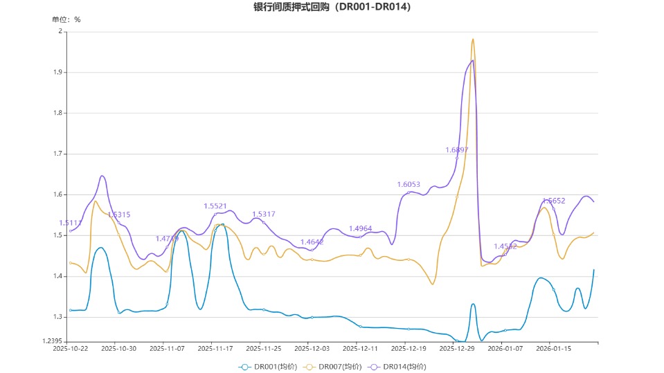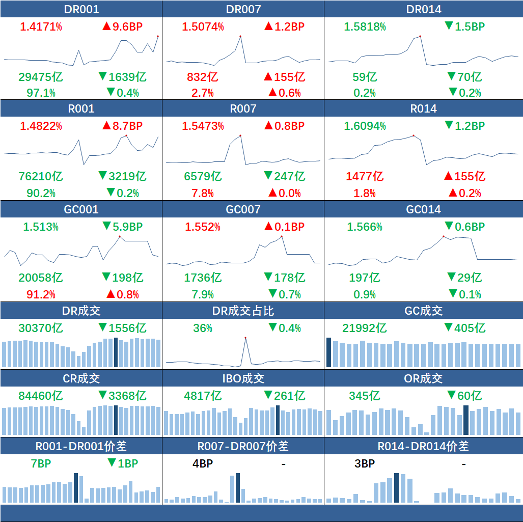 银行间质押式回购市场方面,隔夜品种价格升至1.4%上方。具体看,DR001、R001加权平均利率分别上行9.6BP、8.7BP,报1.4171%、1.4822%,成交额分别减少1639亿元、3219亿元;DR007、R007加权平均利率分别上行1.2BP、0.8BP,报1.5074%、1.5473%,成交额分别增加155亿元、减少247亿元;DR014、R014加权平均利率分别下行1.5BP、1.2BP,报1.5818%、1.6094%,成交额分别减少70亿元、增加155亿元。