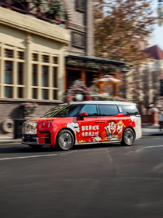 从外观看,极氪009新车配备了专属的旺旺定制皮肤,车身印满旺仔卡通形象与“新年开旺车”等喜庆标语。