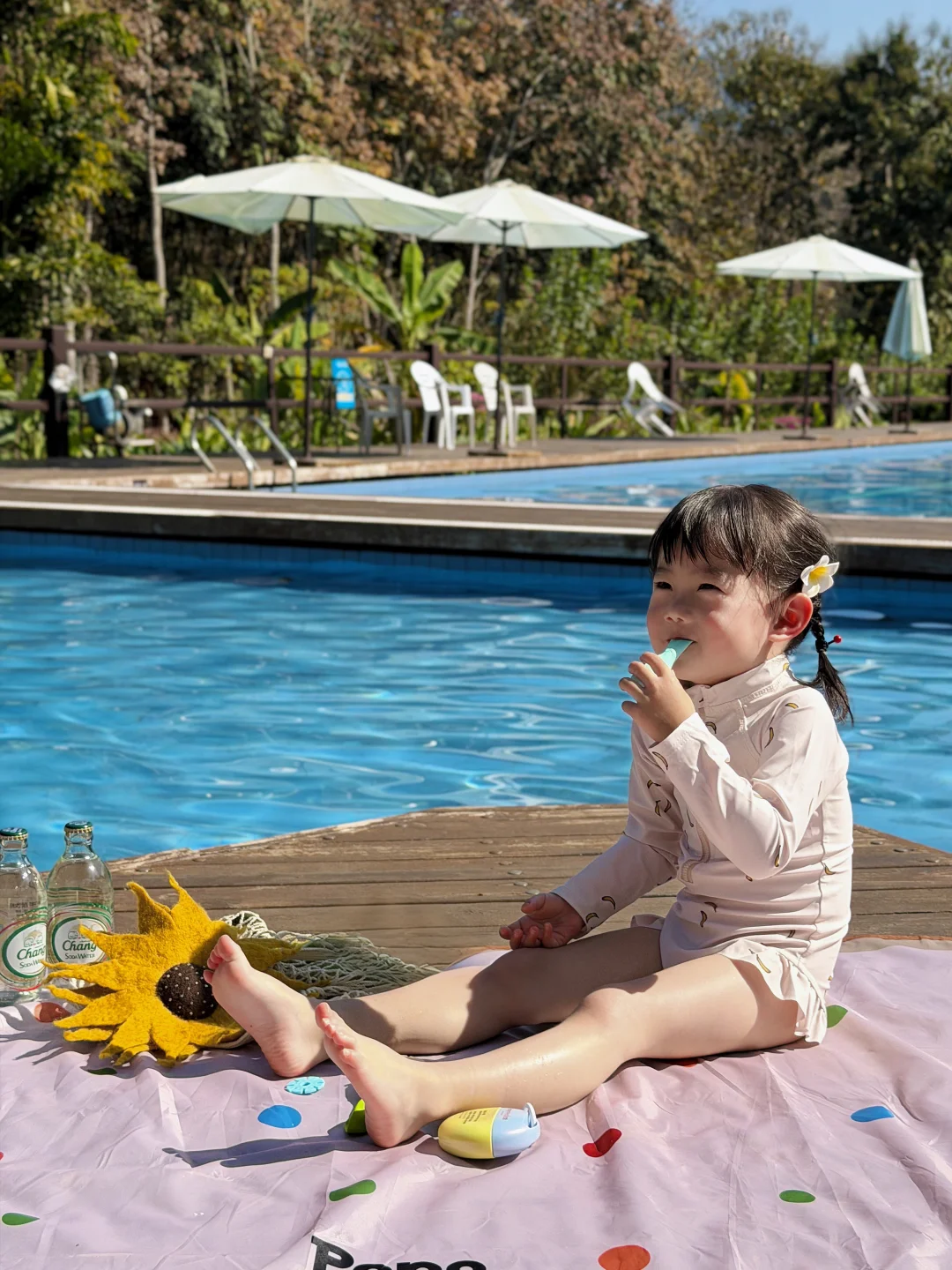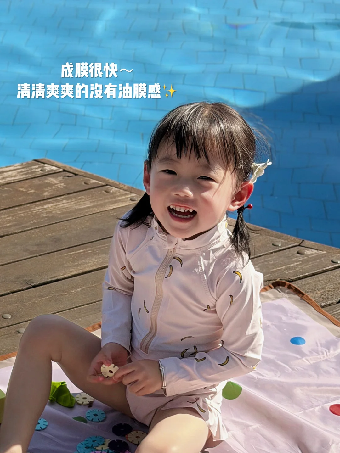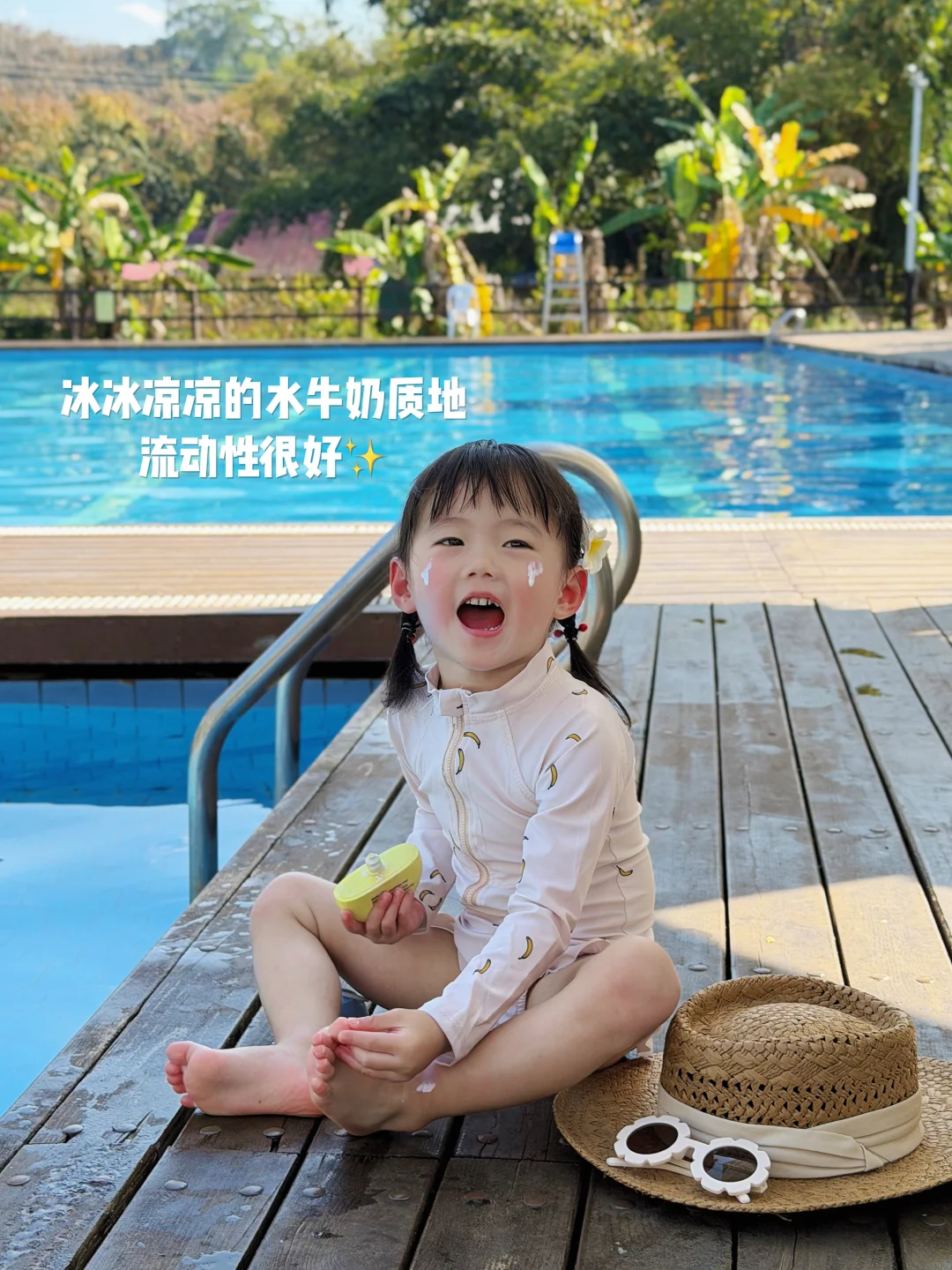 后来才发现,普通防晒根本扛不住这里的强光和高温,还不防水,相当于做了无效防晒,宝宝照样被晒伤晒黑😭