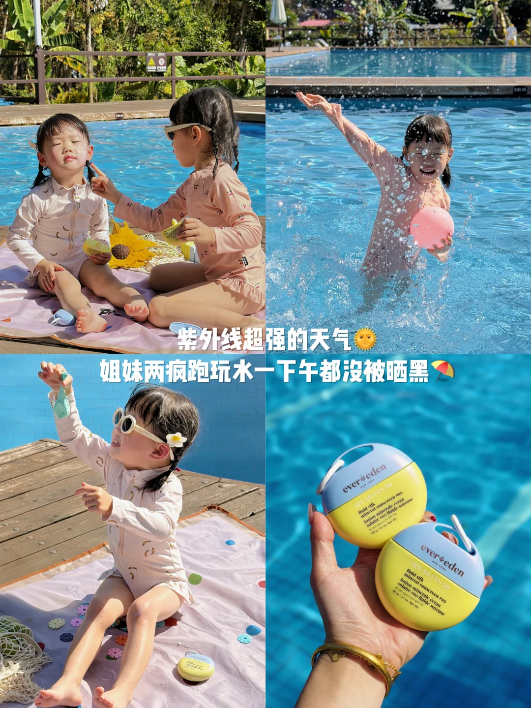 它家的防晒真的绝✌️是SPF50 PA++++的高倍纯物理防晒,这种大颗粒的防晒不会透皮吸收,姐姐这个敏宝用着都没事。重点是8h凉感皮肤衣和防水防汗技术全方位防止宝宝晒黑晒伤,在雨林暴晒都不慌的,姐妹俩在丛林里出汗疯跑,在水里各种撒欢🏖️防晒力一点没减,也不像其他防晒一样会流白汤。