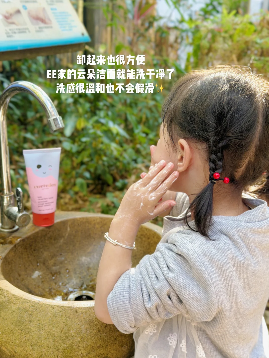 肤感更是戳中我!水牛奶质地冰冰凉凉的,一点不泛白不粘腻,娃跑跳出汗也不会糊脸。贵妇同源的精粹成分还能养肤,洁面一洗就干净😌在雨林里待一天回来小脸蛋还是软乎乎的~