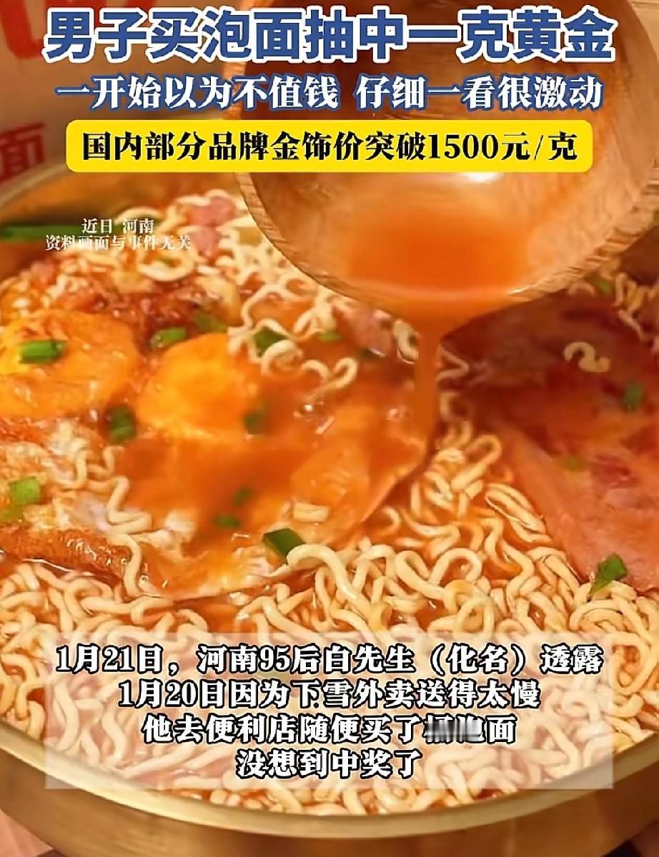这惊喜来的太大了!河南,男子因为点的外卖一直没配送,就下楼买了桶泡面吃,没想到,刚一拆开包装,就看到里面有一个金色小卡片,开始还以为不值钱,可仔细一看,竟然是一克黄金,而且还有证书 1月20日,河南的白先生点了份外卖当晚饭,可外面下着大雪,等了好久都没人接单。他肚子饿得咕咕叫,实在等不及了,就穿上厚外套下楼,在小区超市随手买了一桶泡面。 拆泡面包装时,他看到里面夹着个塑料袋,里面有张证书和一小块金子。一开始他没在意,以为是促销用的装饰金纸,不值钱。可拿起来仔细一看,证书上写着“足金1克”,他这才反应过来:这是真的黄金! 白先生说,自己之前根本不知道这个品牌在搞活动,拆出来后特别激动,本来只是想填个肚子,结果还中了奖。他赶紧联系泡面品牌客服,客服确认中奖后,还说要再送他一箱泡面。 “这运气绝了!我今晚就买同款泡面去!”“吃了这么多年泡面,连‘再来一桶’都难中,人家直接中黄金!”……网友们的评论充满了羡慕,很多人都表示想立刻去试试手气。 说实话,看到这个故事,第一反应是既替他高兴,又有点小小的“嫉妒”。这种“食品里藏真金”的促销,我们平时总听说,但都觉得像都市传说,离自己太遥远。 可这位兄弟的经历告诉我们,幸运有时真的会砸中毫无准备的普通人。他最开始的“不在意”和后来的“很激动”,这种反差特别真实,也特别打动人。 生活就是这样,当你为计划失败(比如没等到外卖)而烦恼时,一个不经意的选择,反而可能送你一份大礼。 一桶普通的泡面,一次无奈的选择,却带来了黄金般的意外收获。生活总有惊喜,幸运可能藏在最普通的地方。 不必总是为眼前的计划落空而过分沮丧。有时候,放下纠结,坦然接受当下的安排,积极地去行动,也许下一个转角,就会遇见一份意想不到的礼物。 这份礼物可能是一克黄金,也可能是一整天的不错心情。保持乐观,拥抱偶然,或许就是我们每个人都能拥有的“好运气”。